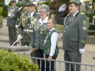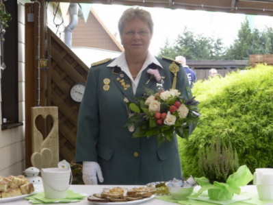 Zum endgültigen Anbringen und Verbleib der Jungkönigsscheibe am Wohnhaus des Jungschützenkönigs Nick Wedemann marschierten die Mitglieder unter zünftiger Marschmusik des „Oldies Spielmannzuges Erika Wintermoor“ vom Schützenplatz zur Residenz der Majestät. Dort wurden die Schützen, Schützinnen und Jungschützen schon mit Spannung erwartet. Nach Feststellen des vorschriftsmäßigen Anbringens der Königsscheibe durch den Polizeioffizier Marc Donauer lud der Jungschützenkönig alle Anwesenden zum reichlich gedeckten Kuchenbuffet und kühlen Getränken ein. Satt und gestärkt marschierten wir später zum Schützenplatz zurück, von wo wir mit einem Bus nach Munster zur Damenbesten Rita Schreiber fuhren, bei der ebenfalls noch die Damenbestescheibe angebracht werden sollte. Auch hier stellten die Oldies wieder ihr Können unter Beweis und sorgten für einen geordneten Marsch zur Residenz der Damenbesten. Das Anbringen der Damenbestescheibe verlief ebenfalls ordnungsgemäß, so dass wir uns rasch erneut an den bereitgestellten festen und flüssigen Nahrungsmitteln stärken konnten. In gemütlicher Runde bei interessanten, aber auch lustigen Gesprächen verbrachten wir einen schönen Nachmittag in „Ritas Garten“, den die Oldies ebenfalls noch mit einigen Musikstücken bereicherten.